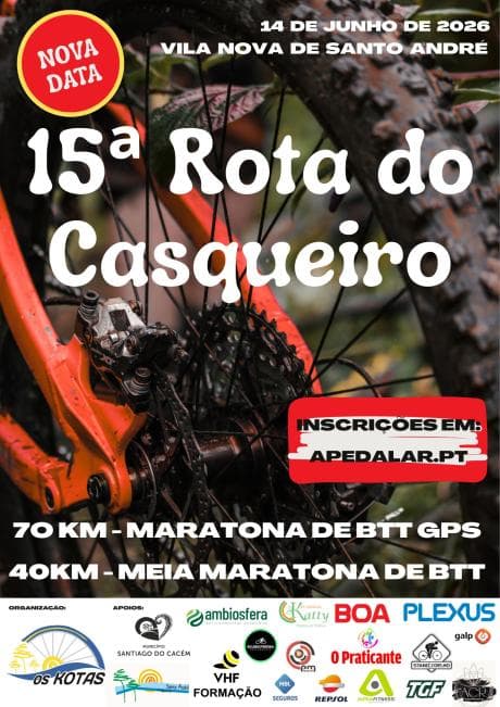 Die 15. Ausgabe des "Rota do Casqueiro" MTB Marathons findet am 14. Juni 2026 in Vila Nova de Santo André statt und ehrt das traditionelle Alentejo-Weizenbrot. Organisiert vom Verein Os Kotas, ist dieses Event Teil des Kalenders des Radsportverbands des Bezirks Setúbal und des Regionalen XCM-Cups und zieht lizenzierte und Amateurfahrer zu einer anspruchsvollen Ausdauer- und Technikveranstaltung an.