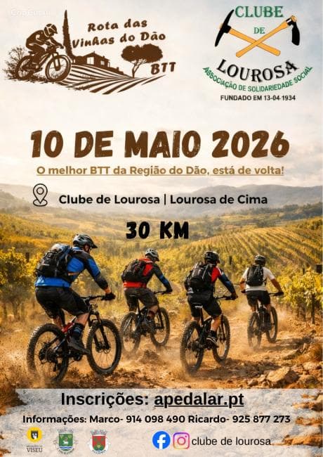 Genieße eine einzigartige und freizeitorientierte Mountainbike-Tour im Herzen der Dão-Region, organisiert vom Clube de Lourosa - Sozialer Solidaritätsverein. Dies ist die 5. Ausgabe dieses Events, das Radfahren in entspannter und freundlicher Atmosphäre feiert.