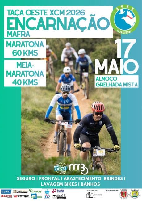 The 4th edition of the Taça Oeste XCM BTT presents its 1st stage in Encarnação, Mafra, on May 17, 2026. Organized by MR3eventus, this amateur marathon mountain bike event is open to all athletes over 18, promoting mountain biking as a leisure ride with time recording and publishing.