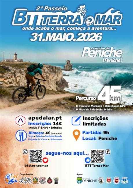 Enjoy the 2nd BTT Terra e Mar ride, a unique event that takes you through the geographical, gastronomic, and cultural highlights of Peniche, promoting physical activity and healthy socializing.