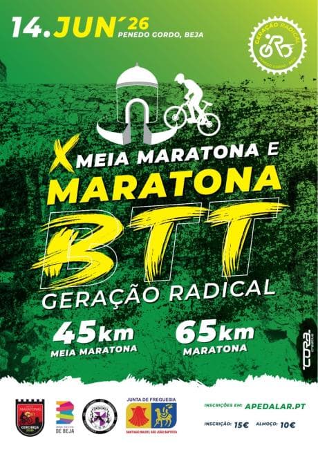 The 10th edition of the Geração Radical Marathon takes place on June 14, 2026, in Penedo Gordo, Beja, organized by Geração Radical/Association of Cycling and MTB of Cavadas. This event is part of the CERCIBEJA Marathon Cup 2026, promoting social inclusion and community responsibility, supporting the CERCIBEJA institution.