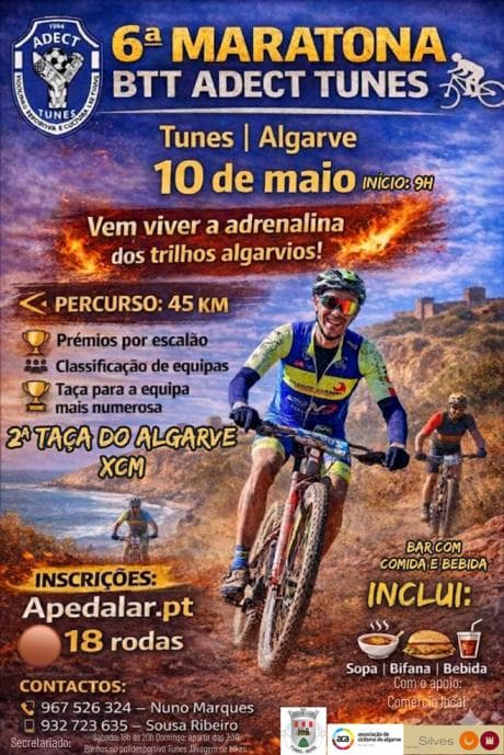 La 2ª Copa Regional de XCM – Tunes se celebra el 10 de mayo de 2026, organizada por ADECT en colaboración con el Ayuntamiento de Silves. Este evento de BTT es imprescindible para los amantes del mountain bike, con rutas desafiantes y ambiente competitivo.