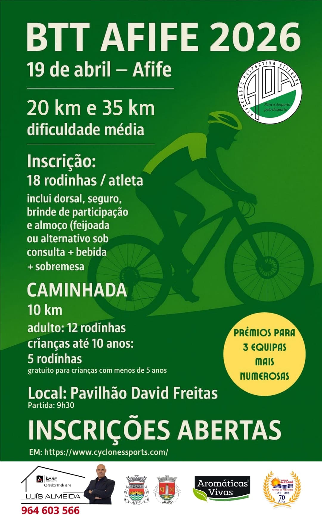 Ressens l'adrénaline des sentiers avec BTT AFIFE 2026, un événement récréatif qui te fait découvrir les chemins magnifiques d'Afife et Carreço. Distances de 35 km et 20 km en VTT et une marche de 10 km pour profiter de la nature à pied ! 🏔️🔥