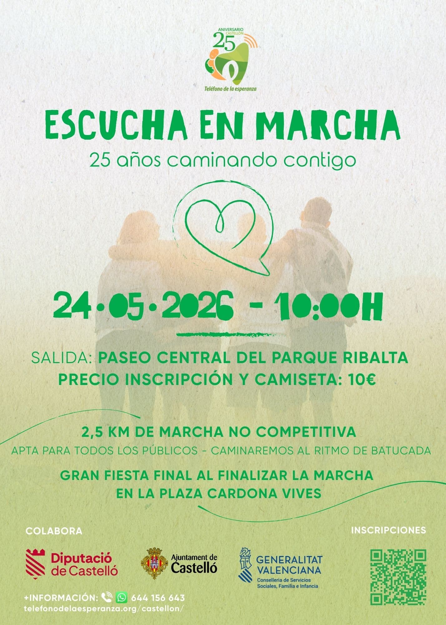 Celebra o 25º aniversário do Teléfono de la Esperanza de Castellón com uma caminhada solidária e festiva de 3 km a 24 de maio de 2026. Junta-te a esta marcha não competitiva que promove a saúde mental e a solidariedade num ambiente animado com batucada e pontos de animação.