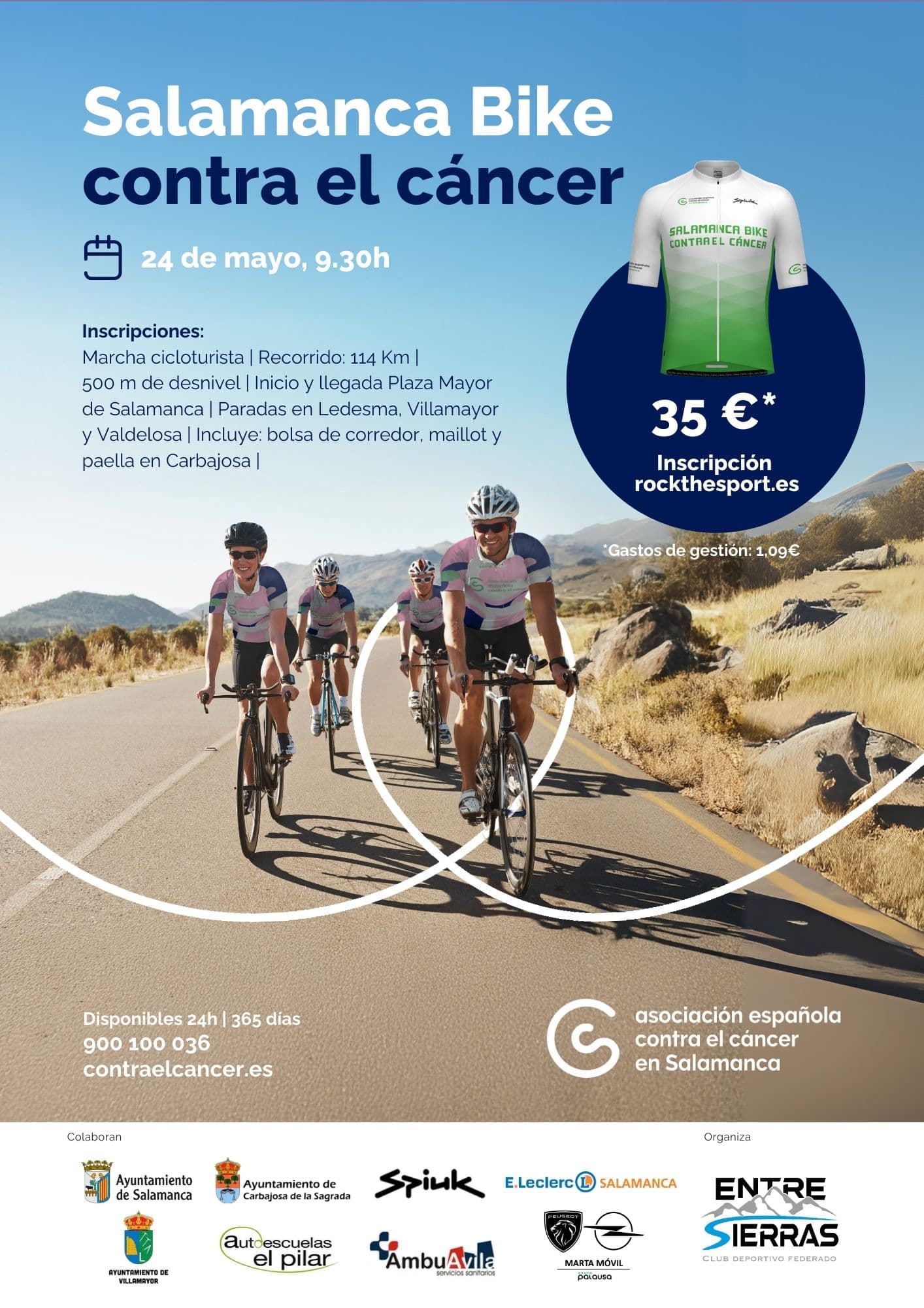 Junta-te a esta primeira edição da Salamanca Bike contra o cancro, uma prova ciclística não competitiva organizada pela Associação Espanhola Contra o Cancro e pelo Clube Desportivo Federado Entresierras. Um evento solidário que percorre 114 km pela província de Salamanca para apoiar uma grande causa.