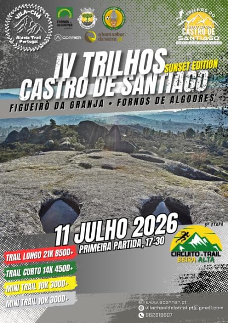The 4th edition of Trilhos Castro de Santiago - Sunset Edition takes place on July 11, 2026, in Figueiró da Granja, Fornos de Algodres! Organized by AVCAT - Associação Vila Chã Aldeia Trail de Portugal, this event is the 5th stage of the Beira Alta Trail Circuit 2026, offering a unique trail running experience at sunset.