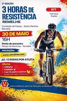 Esta es la 2ª prueba de resistencia en BTT en Remelhe, organizada por la Comisión de Fiestas de Santa Marinha de Remelhe. La prueba se celebra el 30 de mayo de 2026, de 16:00 a 19:00, en el Parque de Meriendas de Remelhe, Barcelos. Un evento que desafía a todos los amantes del BTT a poner a prueba sus límites en un circuito cerrado y seguro.