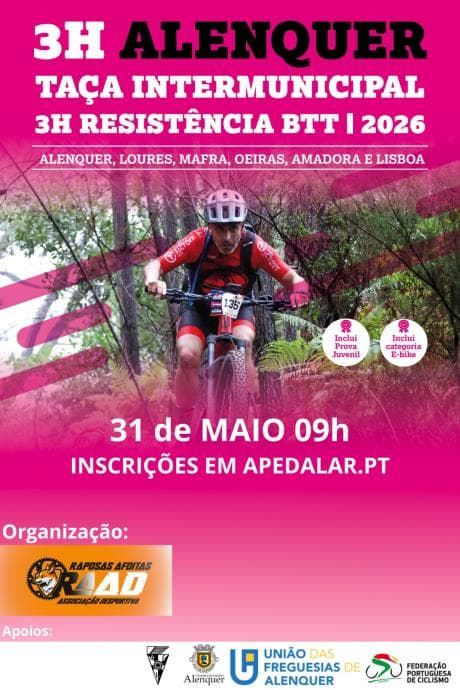Esta emocionante prueba de resistencia en BTT de 3 horas está organizada por la Asociación de Ciclismo de Lisboa y clubes asociados, con seis pruebas intermunicipales en 2026. La primera etapa será en Alenquer el 31 de mayo. Abierta a corredores federados y no federados, hombres y mujeres, desde los 5 años, ofrece adrenalina y desafío.