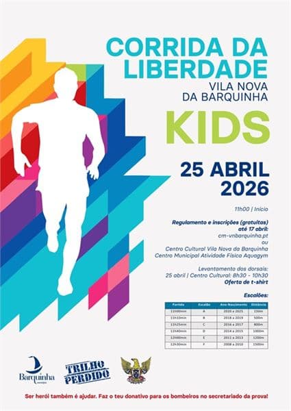 🏃♂️🚸 Course de la Liberté KIDS 2026 Célèbre le 25 avril avec la Course de la Liberté KIDS à Vila Nova da Barquinha ! Un événement sportif et récréatif pour tous les âges, spécialement conçu pour les enfants, avec des épreuves adaptées et beaucoup d'animation.