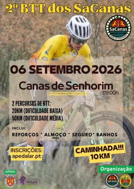 Il 2º BTT dei SaCanas è un evento ludico organizzato dal Grémio Desportivo e Cultural do Mondego e do Dão in collaborazione con il team SaCanas Bike, che si svolge il 6 settembre 2026 a Canas de Senhorim. Questa escursione in mountain bike è aperta a tutti gli appassionati di MTB di età pari o superiore a 10 anni, offrendo un'esperienza unica su sentieri e strade rurali nei comuni di Nelas e Carregal do Sal.
