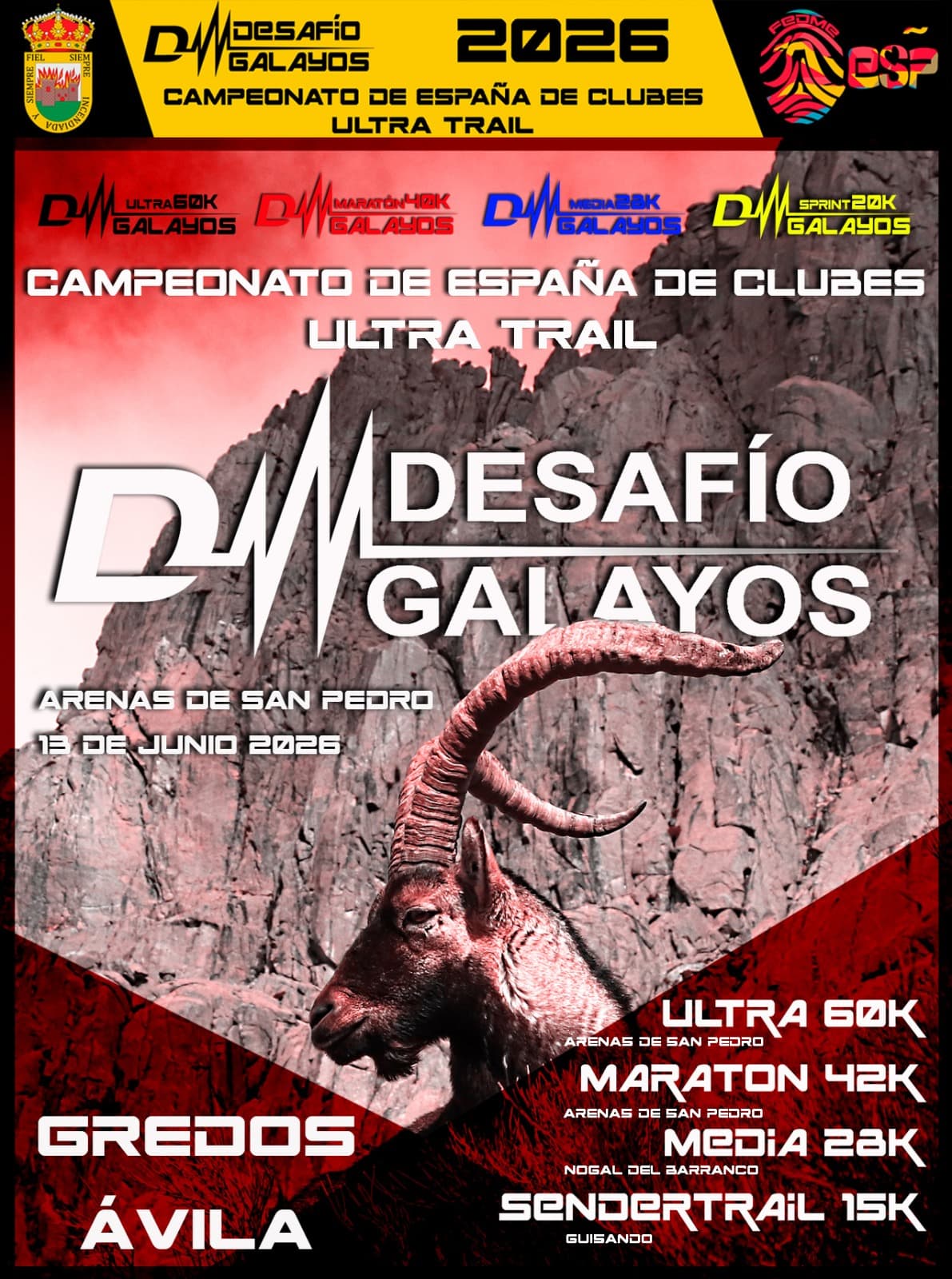 O Desafio Galayos é uma corrida de trail de montanha organizada pelo Club Deportivo Segura Sport e pela Câmara Municipal de Arenas de San Pedro, que se realiza a 13 de junho de 2026. Esta prova, que é Campeonato de Espanha de Clubes FEDME, oferece cinco modalidades que atravessam paisagens espetaculares e terrenos técnicos na Serra de Gredos.