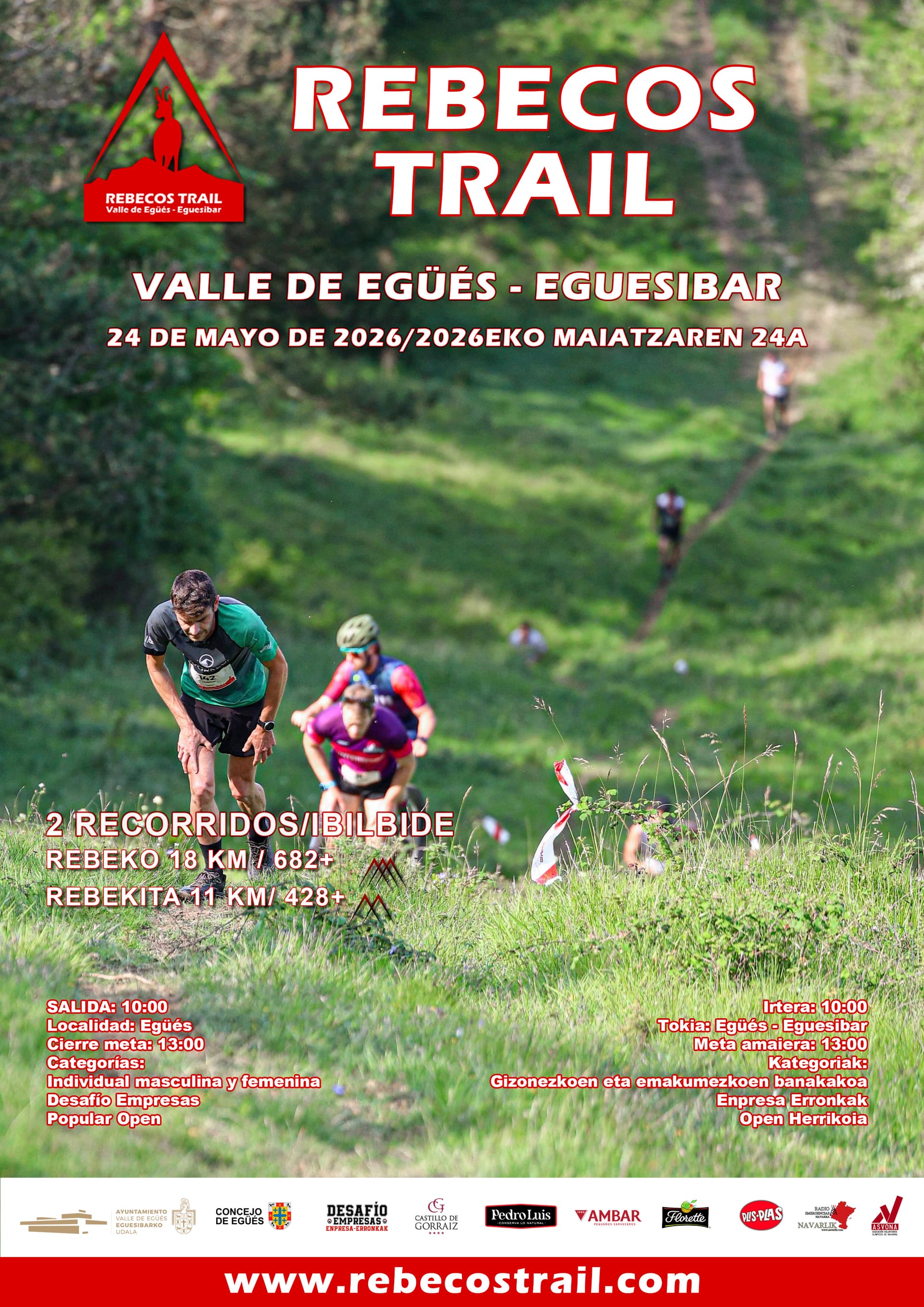 O Rebecos Trail é organizado pela PROGESPORT e realiza-se no vale de Egüés, Navarra. Esta edição mantém o percurso com alguns ajustes, com partida e chegada na localidade de Egüés. Com vagas limitadas a 300 participantes, é uma oportunidade perfeita para iniciares no trail ou desafiares-te num ambiente natural privilegiado.