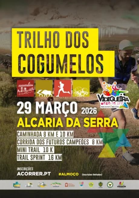 O Trilho dos Cogumelos realiza-se a 29 de março de 2026 em Alcaria da Serra, Vidigueira, distrito de Beja! Organizado pela Câmara Municipal de Vidigueira com o apoio da Junta de Freguesia de Selmes e da Associação de Atletismo de Beja.
