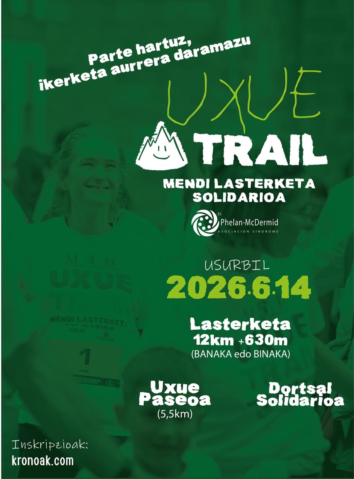 A 6ª edição do Uxue Trail realiza-se a 14 de junho de 2026 em Usurbil, Gipuzkoa, organizada pela Uxuen Lagunak. Este evento solidário visa dar visibilidade e apoio à investigação da Síndrome de Phelan-McDermid, uma doença rara que afeta a menina da aldeia Uxue. Para além de correr, podes colaborar comprando um dorsal solidário. No final da prova haverá sorteios de prémios para os participantes!