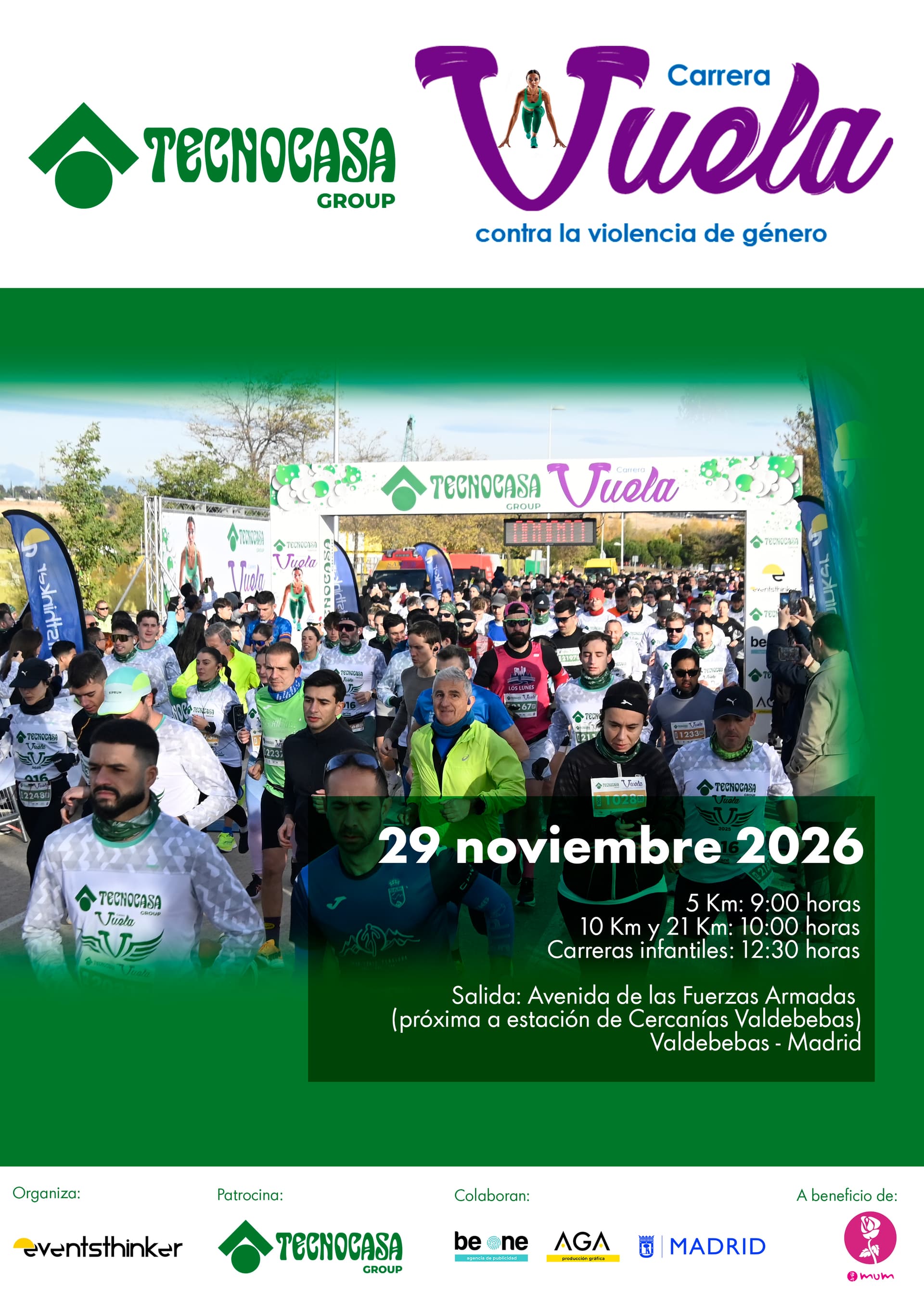A 10ª edição da Corrida TECNOCASA Vuela realiza-se a 29 de novembro de 2026 em Madrid, uma corrida solidária contra a violência de género organizada pela Eventsthinker. Junta-te a esta iniciativa que une desporto e compromisso social num ambiente urbano vibrante.