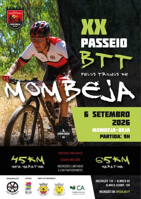 Junta-te a nós no 20º Passeio BTT "Pelos Trilhos de Mombeja", um evento emblemático para os amantes de BTT que procuram desfrutar dos melhores trilhos do concelho de Mombeja. Organizado localmente, este passeio é uma oportunidade única para explorar paisagens naturais e desafiar as tuas capacidades num ambiente amigável e descontraído.